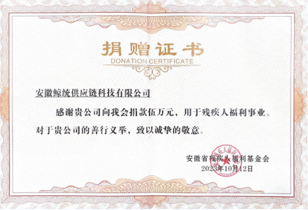 安徽鲸统供应链科技有限公司积极响应安徽省残疾人福利基金会号召加入“99公益日” “助残之路 托养先行”残疾人居家托养项目,向安徽省残疾人福利基金会捐款5万元,用于残疾人福利事业。